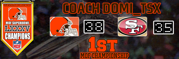 A new champion has arrived. Coach Domi_TSX captures his first ever MOF Super Bowl title, leading the Cleveland Browns to a thrilling 38–35 victory over Coach Beast10790 and the San Francisco 49ers.